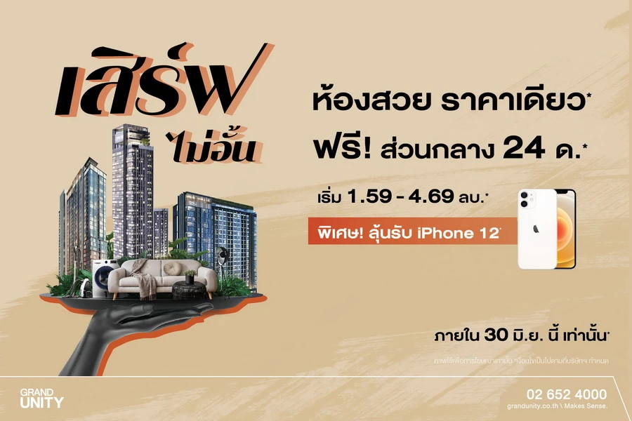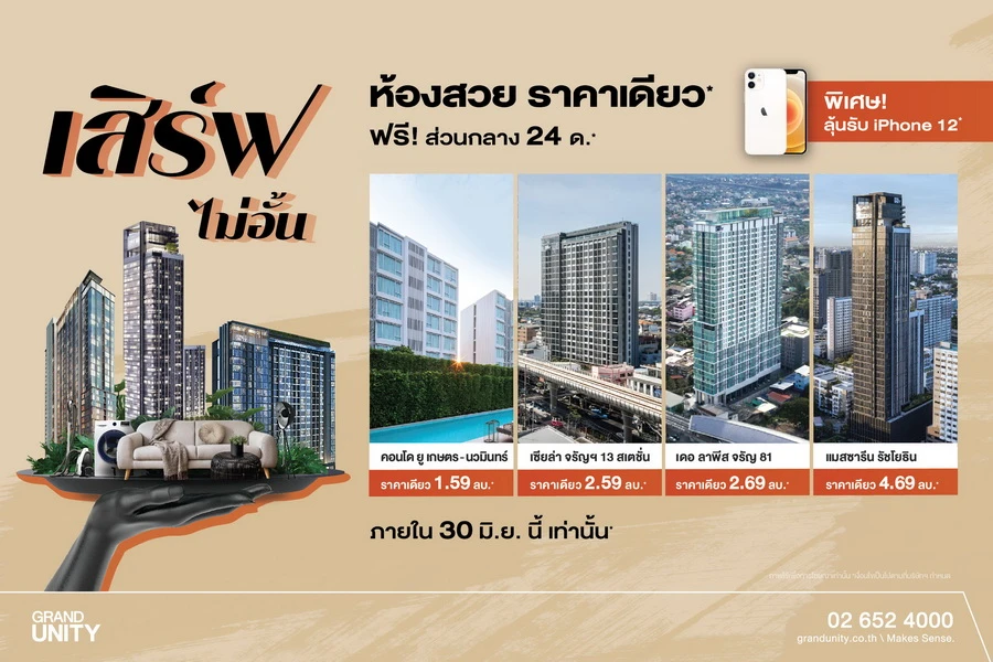 เดินหน้าเสิร์ฟความคุ้มค่าอย่างต่อเนื่องให้กับผู้ที่กำลังมองหาคอนโดมิเนียมพร้อมอยู่ใกล้รถไฟฟ้าในราคาที่คุ้มค่า ล่าสุด! แกรนด์ ยูนิตี้ ส่งแคมเปญพิเศษ "เสิร์ฟไม่อั้น ห้องสวย ราคาเดียว" นำเสนอเมนู จอง 0 บาท* กู้ไม่ผ่านคืนเงิน* ฟรี! ค่าส่วนกลาง 24 เดือน* พร้อมรับส่วนลดพิเศษรวมมูลค่าสูงกว่า 2,000,000 บาท* และยังตบท้ายด้วย Special Menu เป็นสิทธิพิเศษร่วมลุ้นรับโทรศัพท์มือถือ iPhone 12* สำหรับลูกค้าที่ทำการจองและโอนกรรมสิทธิ์คอนโดมิเนียมพร้อมอยู่ใน 4 โครงการของ แกรนด์ ยูนิตี้ ตั้งแต่วันนี้ ถึง 30 มิถุนายน 2564 ประกอบด้วย