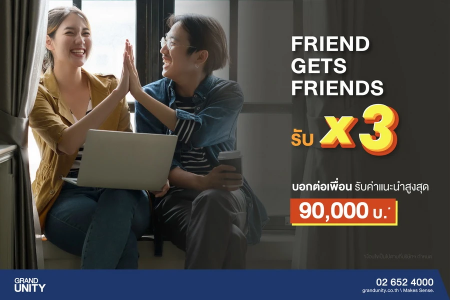 โดยนอกจากความคุ้มค่าของแคมเปญ "เสิร์ฟไม่อั้น ห้องสวยราคาเดียว" ที่ช่วยให้ลูกค้าที่อยากมีที่อยู่อาศัยเป็นของตัวเองตัดสินใจได้ง่ายขึ้นเพราะภาระทางค่าใช้จ่ายที่จะลดลงแล้ว แกรนด์ ยูนิตี้ ยังเพิ่มความคุ้มค่าให้กับกลุ่มลูกค้าเก่าที่แม้จะยังไม่มีแผนซื้ออสังหาริมทรัพย์ในระยะเวลาอันใกล้นี้ ด้วยแคมเปญ 'FRIEND GETS FRIENDS X3' บอกต่อเพื่อน รับค่าแนะนำ 3 เท่า* หรือสูงสุด 90,000 บาท*