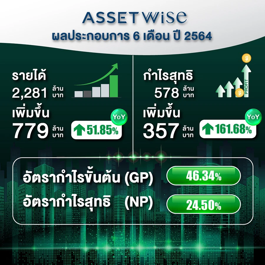 นายกรมเชษฐ์ วิพันธ์พงษ์ ประธานเจ้าหน้าที่บริหาร บริษัท แอสเซทไวส์ จำกัด (มหาชน) (ASW) ผู้พัฒนาอสังหาฯ รุ่นใหม่ เติบโตด้วยกลยุทธ์ "Best Choice" เปิดเผยว่า ผลการดำเนินงานไตรมาส 2/2564 อยู่ในภาวะเติบโตแม้เผชิญหน้ากับสถานการณ์โควิด กลุ่มบริษัทฯ มีกำไรสุทธิ 258.0 ล้านบาท เพิ่มขึ้น 76.1% และมีรายได้รวม 1,107.2 ล้านบาท เพิ่มขึ้น 21.6% อัตรากำไรขั้นต้น (Gross Profit Margin) อยู่ที่ 47.1 % และอัตรากำไรสุทธิ (Net Profit Margin) อยู่ที่ 23.2% ขณะที่ผลการดำเนินงานในงวด 6 เดือนแรกของปี 2564 บริษัทฯมีกำไรสุทธิอยู่ที่ 578.3 ล้านบาท เพิ่มขึ้น 161.7% จากงวดเดียวกันปีก่อน ส่วนรายได้รวมอยู่ที่ 2,281.0 ล้านบาท เพิ่มขึ้น 51.8%