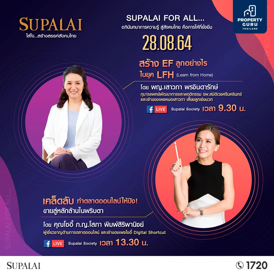 สามารถติดตามรับชม Live ผ่านช่องทาง Facebook : Supalai Society ดูรายละเอียดเพิ่มเติมได้ที่ www.supalai.com หรือ โทร. 1720