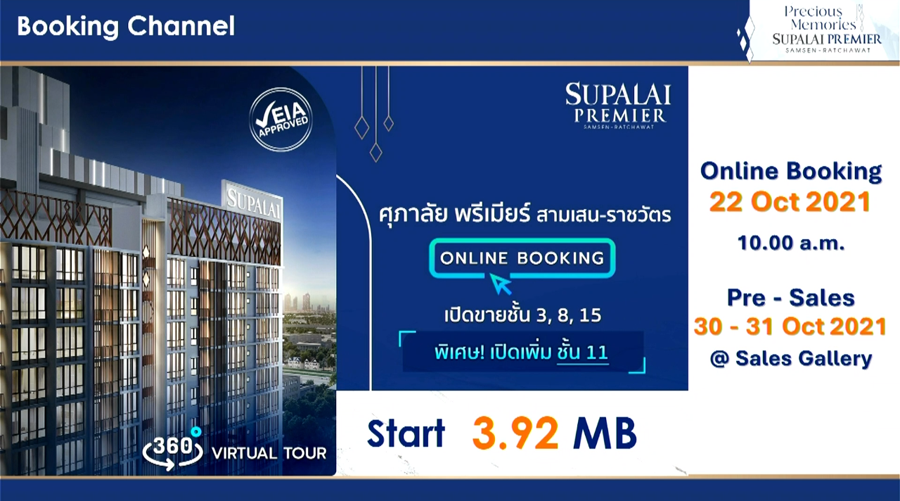 ทั้งนี้ ลูกค้าทุกท่านจะได้สัมผัสความเหนือระดับบนทำเลศักยภาพใจกลางเมือง เชื่อมต่อทุกการเดินทาง ใช้ชีวิตบนแลนด์มาร์คที่ใกล้ไปทุกสิ่งได้แล้ววันนี้ ในราคาเริ่มต้นเพียง 3.92 ล้านบาท เปิดจองรอบพิเศษผ่านระบบ Online Booking วันที่ 22 ต.ค 2564 ตั้งแต่ 10.00 น. เป็นต้นไป และรอบ Pre -Sales วันที่ 30 – 31 ต.ค. 2564 ณ Sales Gallery โดยบริษัทฯ พร้อมดูแลยกระดับมาตรการป้องกันโควิด-19 เพื่อสร้างความเชื่อมั่นและความปลอดภัยในการเข้าเยี่ยมชมโครงการ และสามารถชมห้องตัวอย่างโครงการได้ก่อนใครในรูปแบบออนไลน์ Virtual Tour 360° ได้ที่ Facebook : Supalai Society