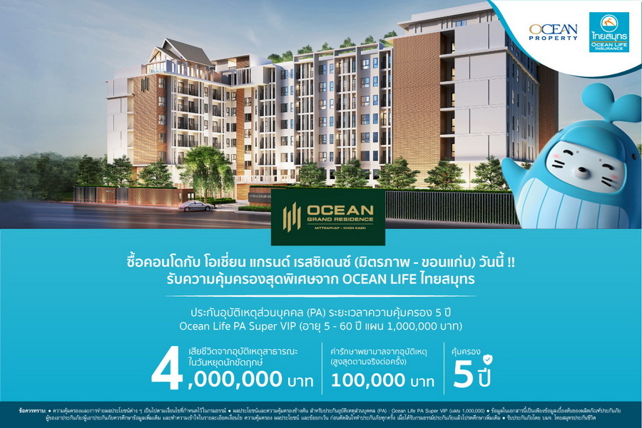 ในส่วนของแผนตลาดช่วงโค้งสุดท้ายปี 2564 นี้เป็นแคมเปญที่ทาง "โอเชี่ยน พรอพเพอร์ตี้" ร่วมกับ "ไทยสมุทรประชีวิต" ได้จัดโปรโมชั่นสุดพิเศษ สำหรับลูกค้าที่ซื้อห้องในโครงการ “โอเชี่ยน แกรนด์ เรสซิเดนซ์ มิตรภาพ - ขอนแก่น" คอนโดมิเนียมโลว์ไรส์ใจกลางเมืองพร้อมสิ่งอำนวยความสะดวกตอบรับกับไลฟ์สไตล์ในปัจจุบัน เพื่อชีวิตอิสระของคนเมืองขอนแก่น ในราคาเริ่มต้น 1.39 ล้านบาท รับฟรีแพ็คเกจประกันชีวิตคุ้มครองสูงสุด 4 ล้านบาท นาน 5 ปี* ตั้งเเต่วันนี้ถึง 30 มิถุนายน 2565