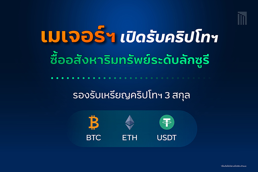 "เมเจอร์ ดีเวลลอปเม้นท์" เปิดช่องทางจอง-ดาวน์-โอนบ้านและคอนโดลักซูรี รองรับเหรียญคริปโทฯ 3 สกุล BTC-ETH-USDT พร้อมฟรีค่าธรรมเนียม* มั่นใจแลนด์สเคปลูกค้าเซ็กเมนต์หรูมีโอกาสโตสูง หลังมูลค่าคริปโทฯพุ่งต่อเนื่อง ย้ำกระแส Touchless Payment ตอบโจทย์ไลฟ์สไตล์ยุค Next Normal เริ่ม 1 ธ.ค.นี้