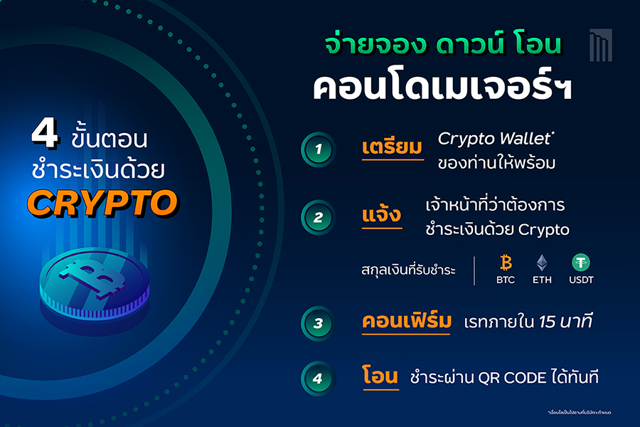 ทั้งนี้ บริษัทฯ รองรับการจอง วางเงินดาวน์ และชำระเพื่อโอนกรรมสิทธิ์คอนโดมิเนียม ด้วยเหรียญคริปโทเคอร์เรนซีที่ได้รับความเชื่อมั่นจากตลาดโลกและมีโอกาสสร้างมูลค่าในอนาคตทั้งหมด 3 สกุล ได้แก่ บิทคอยน์ (Bitcoin - BTC) อีเธอเรียม (Ethereum - ETH) และเทเทอร์ (Tether USD - USDT) ในการซื้อโครงการระดับลักซูรีและไฮเอนด์ โดยฟรีค่าธรรมเนียม* เริ่มเปิดให้ใช้บริการ 1 ธ.ค.นี้