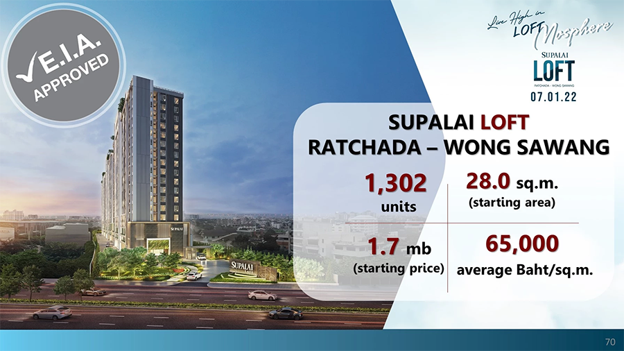 ในปี 2565 นี้ บริษัทฯ ลุยต่อเนื่องเตรียมเปิดตัวโครงการคอนโดฯ ใหม่ ศุภาลัย ลอฟท์ รัชดา-วงศ์สว่าง (Supalai Loft Ratchada - Wongsawang) คอนโดฯ High Rise 18 ชั้น มูลค่าโครงการ 3,200 ล้านบาท ตั้งอยู่บนทำเลระหว่างกรุงเทพ ฯ – นนทบุรี ซึ่งเป็นทั้งพื้นที่อยู่อาศัยและเป็นพื้นที่แหล่งทำงาน เชื่อมต่อถนนหลายสาย สามารถเดินทางได้อย่างสะดวกสบาย ใกล้รถไฟฟ้าสายสีม่วงสถานีวงศ์สว่าง สถานีกลางบางซื่อ ใกล้ทางพิเศษศรีรัช ด่านประชาชื่น และด่านรัชดาภิเษก ถัดมาจะเป็นโรงพยาบาลเกษมราษฎร์ ประชาชื่น ซึ่งห่างจากโครงการเพียง 600 เมตร อีกทั้งยังใกล้แหล่งสถานศึกษา อาทิ โรงเรียนหอวัง, โรงเรียนโยธินบูรณะ, มหาวิทยาลัยเกษตรศาสตร์ และมหาวิทยาลัยธุรกิจบัณฑิตย์ พร้อมเชื่อมต่อคอมมูนิตี้มอลล์ และห้างสรรพสินค้าชั้นนำ เพียง 10 นาทีถึงเซ็นทรัลพลาซา ลาดพร้าว