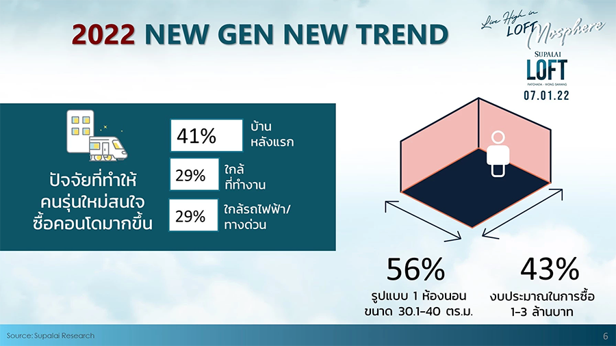 ซึ่งแนวโน้มในปี 2565 คาดการณ์ว่า ตลาดคอนโดฯ เปิดใหม่ ราคาไม่เกิน 3 ล้านบาท จะกลับมามีสีสัน และขยายตัวเพิ่มมากขึ้น กลุ่มลูกค้าตลาดนี้ส่วนใหญ่จะเป็นกลุ่มคนรุ่นใหม่ วัยทำงาน ที่พร้อมจะซื้อที่อยู่อาศัยหลังแรกเป็นของตัวเอง ในขณะเดียวกันบริษัทฯ พร้อมขยายฐานลูกค้าเจาะกลุ่ม NEW GEN สร้างสรรค์ผลิตภัณฑ์คุณภาพ และราคาให้ตอบโจทย์กลุ่มคนเหล่านี้มากยิ่งขึ้น