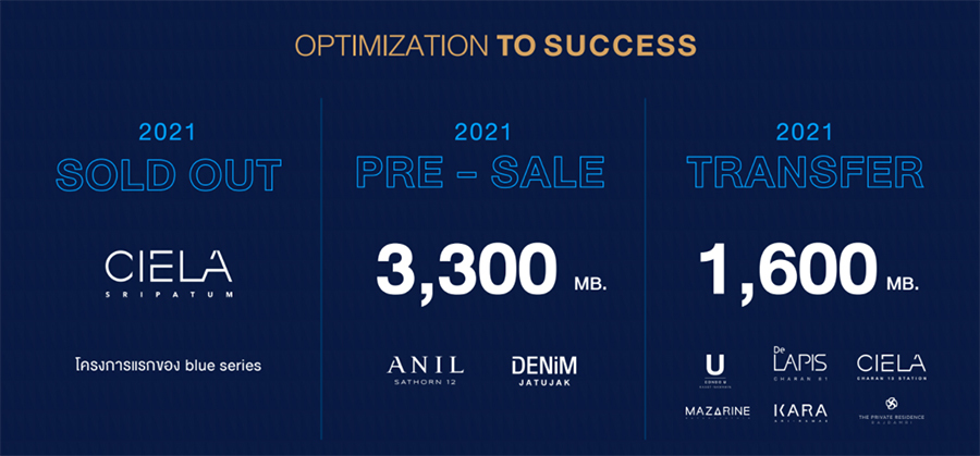 “ปี 2564 ที่ผ่านมา เราได้ดำเนินตามแผนธุรกิจอย่างต่อเนื่อง เพื่อตอบสนองความต้องการของลูกค้าที่มองหาคอนโดมิเนียมภายใต้สถานการณ์ที่ต้องใช้ความรอบคอบในการตัดสินใจมากขึ้น ซึ่งพิสูจน์แล้วว่าลูกค้าได้เล็งเห็นถึงคุณภาพหรือ Product Excellence ที่เรามอบให้ในทุกๆ ขั้นตอน ทั้งการเลือกใช้วัสดุในการก่อสร้างและ Zero Defect ทำให้สามารถปิดการขายโครงการ เซียล่า ศรีปทุม (Ciela Sripatum) ได้เป็นที่เรียบร้อย นอกจากนี้ ยังได้พัฒนาโครงการต่างๆ ให้มีคุณภาพเป็นที่ยอมรับในระดับสากล อย่างการพัฒนาโครงการ {1450922,} ซึ่งถือเป็นโครงการที่พักอาศัยแห่งแรกของไทยที่ได้รับรองตามมาตรฐานความเป็นอยู่ระดับโลก WELL Multifamily PrecertifiedTM ระดับ Gold ตามมาตรฐาน WELL Building StandardTM จาก International WELL Building InstituteTM (IWBITM) ประเทศสหรัฐอเมริกา ไปจนถึงด้านการบริการ บริษัทฯ เสริมความแข็งแกร่งด้วยการร่วมมือกับบริษัท เซนเซส พร็อพเพอร์ตี้ แมเนจเม้นท์ จำกัด (SENSES) ที่มีประสบการณ์และความเชี่ยวชาญในการบริหารพื้นที่อาคารที่พักอาศัย เข้ามาช่วยบริหารจัดการงานนิติบุคคลอาคารชุดแบบครบวงจร รวมถึงการพัฒนาทรัพยากรบุคคลของเราอย่างต่อเนื่อง