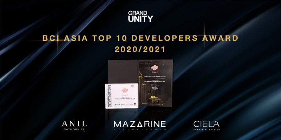 จากการพัฒนาคุณภาพอย่างต่อเนื่องนี้ จึงเป็นที่น่ายินดีอย่างยิ่งที่ แกรนด์ ยูนิตี้ สามารถคว้ารางวัล “BCI Asia Top 10 Developers Award 2020” ซึ่งเป็นรางวัลที่ยิ่งใหญ่ระดับภูมิภาคเอเชีย โดยเป็นผลงานจากการพัฒนาโครงการภายใต้ BLUE Series 3 โครงการ ได้แก่ โครงการ อนิล สาทร 12 (ANIL Sathorn 12), โครงการ แมสซารีน รัชโยธิน (MAZARINE Ratchayothin) และโครงการ เซียล่า จรัญฯ 13 สเตชั่น (CIELA Charan 13 Station) โดยสะท้อนคุณภาพและความโดดเด่นในด้านการพัฒนาผลิตภัณฑ์และบริการสู่ความเป็นเลิศในทุกมิติอย่างแท้จริง