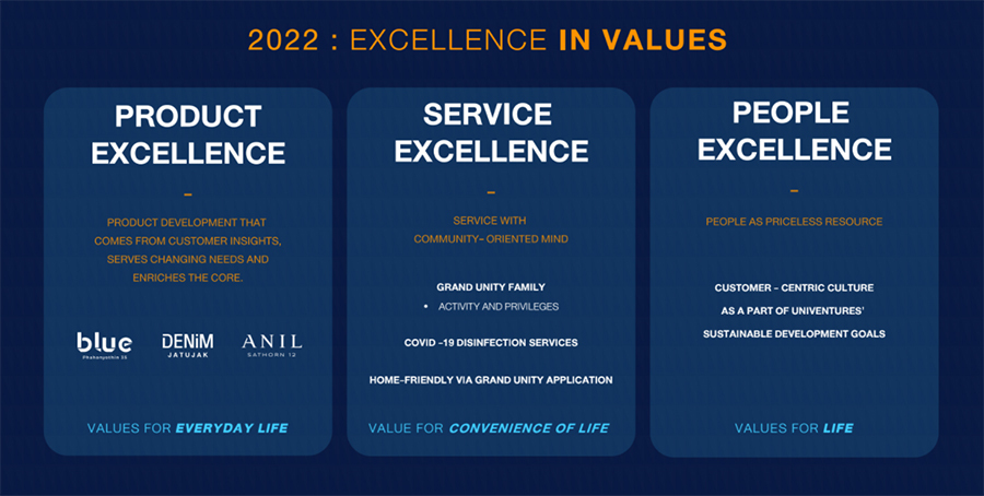 สำหรับปี 2565 ถือเป็นอีกหนึ่งโอกาสสำคัญในการพลิกเกมการดำเนินธุรกิจของแกรนด์ ยูนิตี้ ต่อเนื่องจากปี 2564 ซึ่งถือเป็นปีแห่งการปรับเปลี่ยนและทบทวนกลยุทธ์องค์กร หรือ The Year of Optimization โดยในปีนี้ บริษัท ชูวิสัยทัศน์ Excellence in Values เพื่อยกระดับ 3 กลยุทธ์สำคัญไปสู่การส่งต่อคุณค่าที่เป็นเลิศให้กับลูกค้าได้แก่