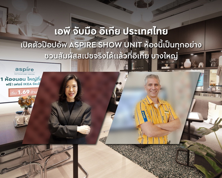 บริษัท เอพี (ไทยแลนด์) จำกัด (มหาชน) ผู้นำด้านการพัฒนาอสังหาริมทรัพย์ ภายใต้พันธกิจ EMPOWER LIVING นำโดยนางสาวกมลทิพย์ บำรุงชาติอุดม รองกรรมการผู้อำนวยการ สายงานธุรกิจคอนโดมิเนียม เปิดเกมส์รุกตลาดคอนโดครองใจคนเมืองนิวเจเนอเรชั่น จับมือพันธมิตรล่าสุด “อิเกีย ประเทศไทย” นำโดย มร. ทอม ซูเทอร์ ผู้จัดการสโตร์ อิเกีย ประเทศไทย เปิดตัวป๊อปอัพ “แอสปายโชว์ยูนิต” (ASPIRE Show Unit) ภายใต้คอนเซ็ปต์ “ห้องนี้เป็นทุกอย่าง”