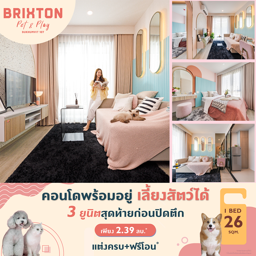 บริกซ์ตัน เพ็ทแอนด์เพลย์ สุขุมวิท 107 (Brixton Pet & Play Sukhumvit 107) คอนโดเลี้ยงสัตว์ได้ กู้ได้ 100% รูปแบบ 1 ห้องนอน ครบจบทุกฟังก์ชั่นการใช้งาน 3 ยูนิตสุดท้าย ก่อนปิดตึก!! ฟรีเฟอร์นิเจอร์ Built-in แต่งครบ ฟรีโอน ราคา 2.39 ล้าน บนทำเลใกล้ BTS แบริ่ง เพียง 2 นาที ไม่ใช่แค่เลี้ยงสัตว์ได้แต่ยังดูแลได้ครบวงจร อาทิ โรงแรมฝากเลี้ยง ร้านขายอาหารและอุปกรณ์สัตว์เลี้ยง มีบริการรองรับทั้งการทำประกันชีวิตสัตว์ รักษาสัตว์ ฉีดวัคซีน และตรวจสุขภาพสัตว์ประจำปีพร้อมให้บริการอย่างครบวงจร