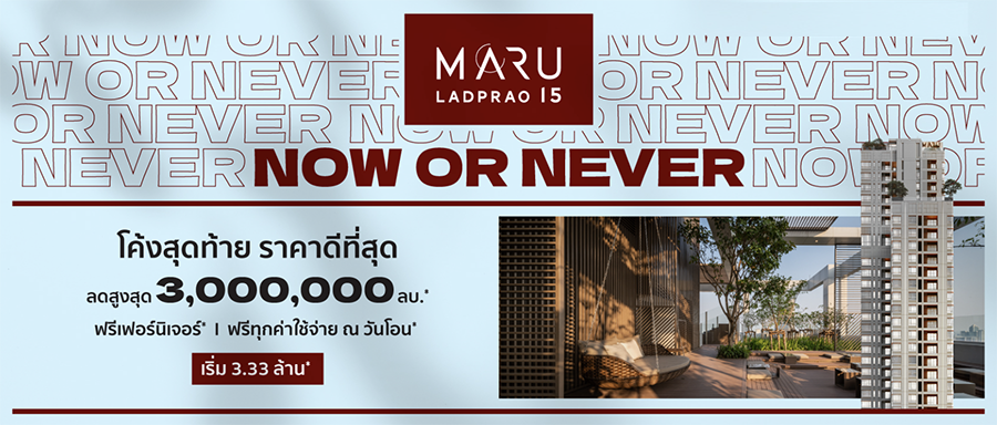 มารุ ลาดพร้าว 15 (MARU Ladprao 15) คอนโดพร้อมอยู่จากเมเจอร์ ดีเวลลอปเม้นท์ เพียง 50 เมตร จาก MRT ลาดพร้าว ส่วนกลางครบครัน พร้อมส่วนกลางที่รองรับเพื่อนรักตัวน้อยสี่ขา 1 ห้องนอน 30-35 ตร.ม. เริ่ม 3.33 ล้านบาท* มาพร้อมโปรโมชั่น NOW OR NEVER โค้งสุดท้าย ราคาดีที่สุด หมดแล้วหมดเลย