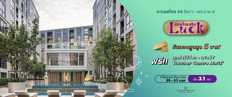 มาเอสโตร 03 รัชดา - พระราม 9 (Maestro 03 Ratchada - Rama 9) คอนโดพร้อมอยู่บนทำเล New CBD รายล้อมด้วยอาคารสำนักงาน และห้างสรรพสินค้า ใกล้ MRT พระราม 9 รัชดา จัดโปรโมชั่น "คอนโดเสริมรัก" จองวันนี้ LUCK เลย ไม่ต้องรอลุ้น พิเศษ 1 ห้องนอน Plus sizw ขนาด 29 - 33 ตร.ม. เริ่ม 3.1 ล้านบาท*