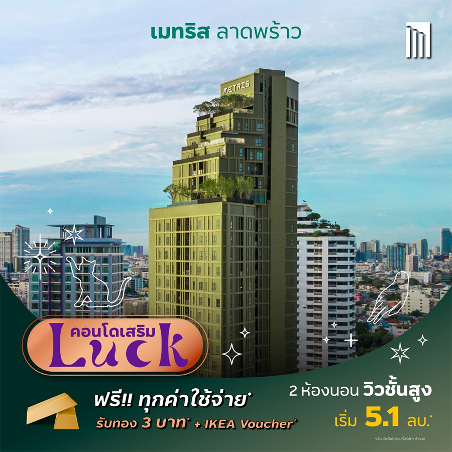 เมทริส ลาดพร้าว (Metris District Ladprao) คอนโดเลี้ยงสัตว์ได้ที่เป็นส่วนตัวที่สุดเพียง 193 ยูนิต เพียง 250 ม. จาก MRT พหลโยธิน รับโปรโมชั่น "คอนโดเสริมรัก" จองวันนี้ LUCK เลย ไม่ต้องรอลุ้น พิเศษ 2 ห้องนอนใหญ่ วิวชั้นสูง เริ่ม 5.1 ล้านบาท*
