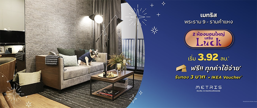 เมทริส พระราม 9-รามคำแหง (Metris Rama 9-Ramkhamheang) คอนโดพร้อมอยู่ส่วนกลางครบ ฟิตเนส 2 ชั้น ใกล้รถไฟฟ้าและทางด่วน ออกแบบให้มีพื้นที่สำหรับสัตว์เลี้ยง จัดโปรโมชั่น "คอนโดเสริมรัก" จองวันนี้ LUCK เลย ไม่ต้องรอลุ้น พิเศษ 2 ห้องนอนใหญ่ 49 ตร.ม. เริ่ม 3.92 ล้านบาท*