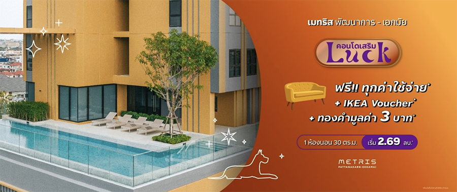 เมทริส พัฒนาการ - เอกมัย (Metris Pattanakarn - Ekkamai) รวมโปรฯ คอนโดเสริม LUCK จาก เมเจอร์ฯ ให้ลูกค้ารับ "LUCK" กันทุกวัน ตลอดทั้งเดือนแห่งความ "รัก" ให้คุกกี้ทำนายกันโดยการจับคุกกี้เสี่ยงทายรับคำทำนายสุดปัง หรือจะปังไปกว่านั้นรับเลยบัตร STARBUCK มูลค่า 200 บาท พิเศษห้องพักอาศัยแบบ 1 ห้องนอนใหญ่ พื้นที่กว้าง เริ่ม 2.69 ล้านบาท ตั้งแต่ วันนี้ - 28 กุมภาพันธ์ 2565 จำนวนจำกัด