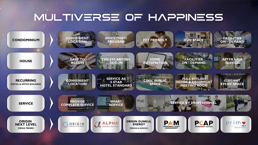 “ออริจิ้น พร็อพเพอร์ตี้” เปิดแผนการเติบโตแบบพหุจักรวาล “Origin Multiverse” กับ 3 ขั้นตอน Expanding-Growing-Connecting ขยายอาณาจักรจากธุรกิจอสังหาฯสู่ 4 กลุ่มจักรวาลธุรกิจควบหลากธุรกิจใหม่ ทั้งโลจิสติกส์-เฮลท์แคร์-ประกันภัย-พลังงาน-การเงิน-ร้านอาหาร-กัญชง จัดทัพมืออาชีพกุมบังเหียนการเติบโตจักรวาลย่อย วางแผนปั้นบริษัทในเครือเข้าจดทะเบียนในตลาดหลักทรัพย์เพิ่ม นำร่องด้วย พรีโม เซอร์วิส โซลูชั่น-วัน ออริจิ้น-แอลฟา อินดัสเทรียล โซลูชั่น หวังเกิด Multiverse of Happiness เชื่อมทุกจักรวาลสู่อาณาจักร Market Cap รวมแสนล้านภายในปี 2568 สร้างอีโคซิสเท็มที่ยกระดับคุณภาพชีวิตผู้บริโภคได้แบบครบวงจร ด้านจักรวาลที่อยู่อาศัยปี 2565 ตั้งเป้าทุกด้าน All Time High เปิดตัวโครงการใหม่เฉียด 42,000 ล้าน ตั้งเป้ายอดขายที่ 35,000 ล้าน พร้อมลุยเมกะโปรเจกต์แห่งปี “ออริจิ้น ทองหล่อ เวิลด์”