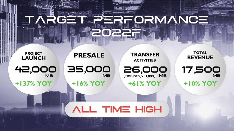 ขณะเดียวกัน บริษัทตั้งเป้ายอดขายไว้ที่ 35,000 ล้านบาท ตั้งเป้ารายได้รวม 17,500 ล้านบาท หลังจากปี 2564 ทำผลงานทุกด้านเติบโตได้อย่างยอดเยี่ยม สร้าง New High ยอดโอนรวมโครงการกิจการร่วมค้ากว่า 16,157 ล้านบาท มีรายได้รวม 15,943 ล้านบาท และเติบโตจากช่วงเดียวกันของปี 2563 กว่า 43% อีกทั้ง มีกำไรสุทธิ 3,194 ล้านบาท เติบโตจากปี 2563 กว่า 20% ส่งผลให้บริษัทเตรียมจ่ายปันผลให้แก่ผู้ถือหุ้นงวดสิ้นปี 2564 ในอัตรา 0.42 บาท ต่อหุ้น