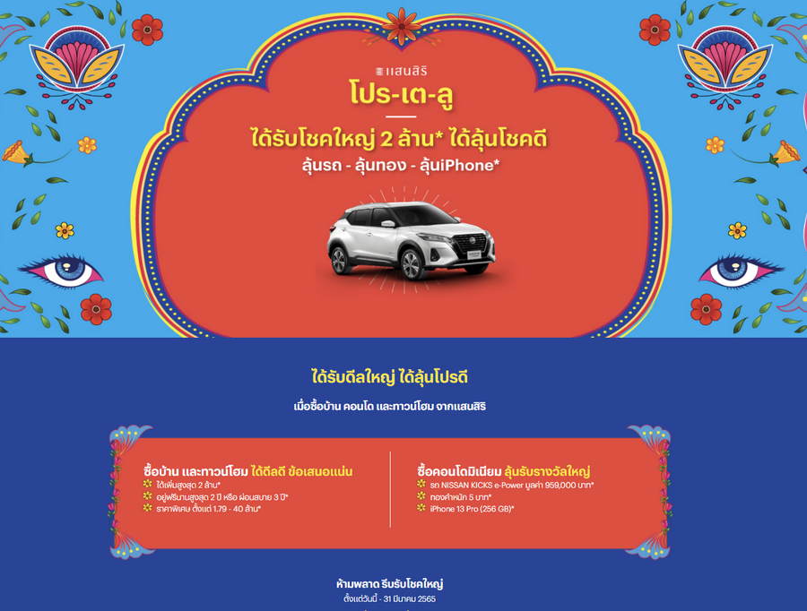 โปรเตลู โชคใหญ่มาถึงมือคุณแล้ว ซื้อบ้าน ทาวน์โฮม จากแสนสิริ ได้เลยโชคใหญ่สูงสุด 2 ล้าน* อยู่ฟรีนาน 2 ปี หรือ โชคใหญ่ผ่อนสบาย 3 ปี ราคา 1.79 - 40 ล้าน* ห้ามพลาด! รีบรับโชคใหญ่ วันนี้ - 31 มี.ค. 65