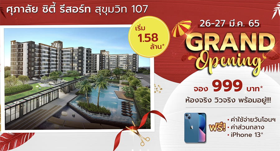 ศุภาลัย ซิตี้ รีสอร์ท สุขุมวิท 107 Grand Opening 26-27 มี.ค. นี้ งานเปิดตัวอย่างเป็นทางการ กับคอนโดฯพร้อมอยู่ สไตล์ รีสอร์ท ใจกลางแบริ่ง ใกล้ BTS กับห้องหลายแบบ หลายฟังก์ชันให้เลือก ตั้งแต่ 28.5 - 69.5 ตร.ม. มาพร้อมสิ่งอำนวยความสะดวกครบครัน ในราคาเริ่มต้น 1.58 ล้านบาท* กู้ได้ 100%*  รับมาตรการ LTV
