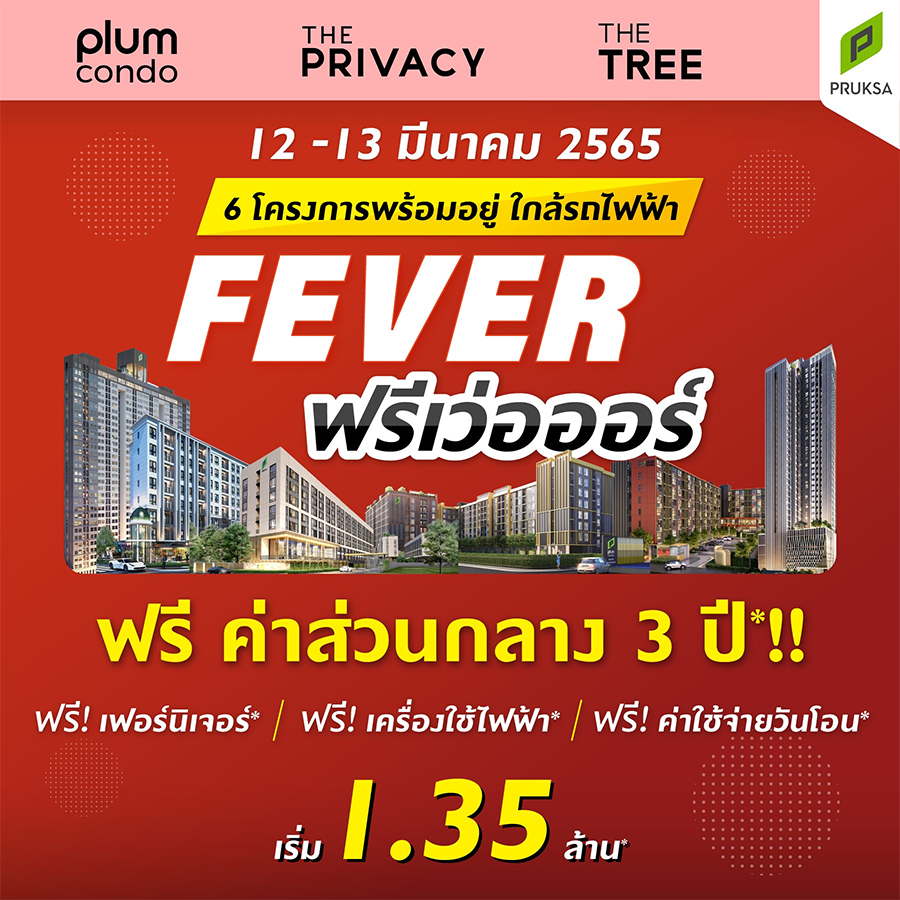 พฤกษา เรียลเอสเตทฯ เสิร์ฟโปรฯ "FEVER ฟรีเว่อออร์" งานนี้เราให้ฟรี แบบ เว่อร์ เว่อร์ ไม่จองตอนนี้ไม่มีอีกแล้ว 12-13 มีนาคมนี้ จอง 6 คอนโดมิเนียมพร้อมอยู่ใกล้รถไฟฟ้า* กู้เต็ม 100+ รับฟรีแบบเว่อร์วัง เริ่ม 1.35 ล้าน* จองเพียง 1,999 บาท*