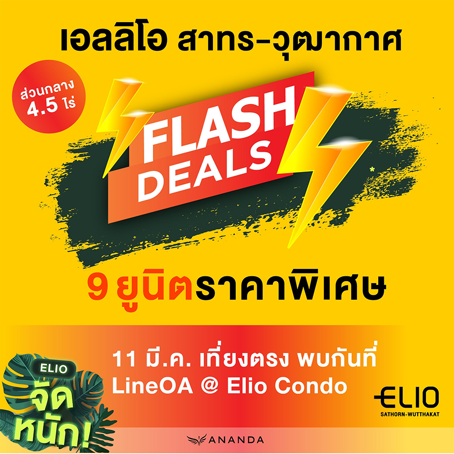 คอนโด เอลลิโอ สาทร - วุฒากาศ จัดโปรฯ "FLASH DEALS" วันเดียวเท่านั้น 11 มี.ค. นี้ พบ 9 ยูนิตราคาสุดพิเศษ ที่ไม่เคยเห็นที่ไหนมาก่อน เฟอร์ฯครบ* พร้อมอยู่ พลาดแล้วพลาดเลย