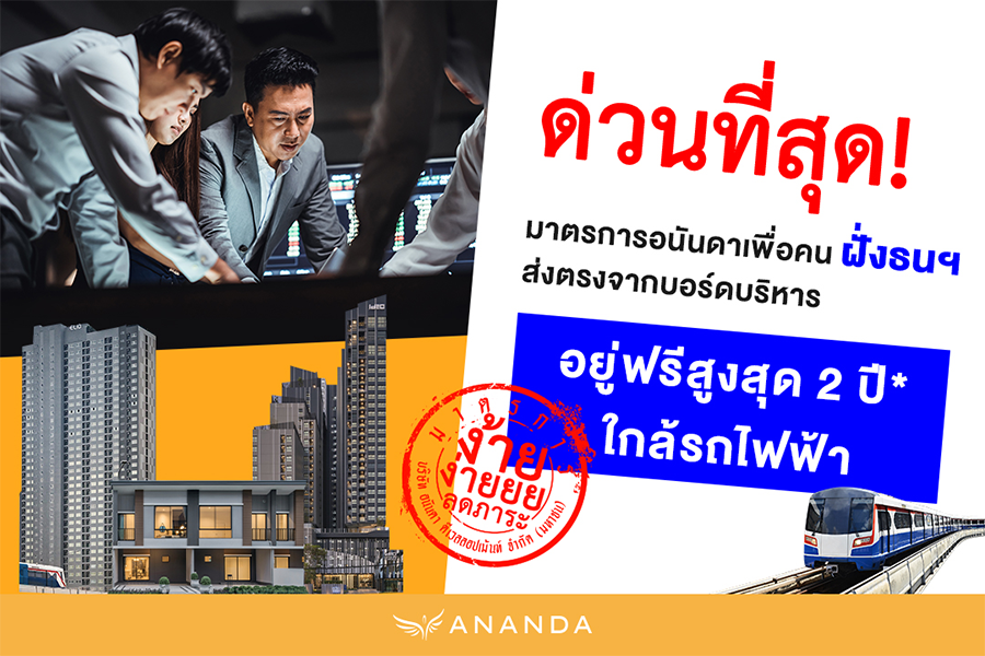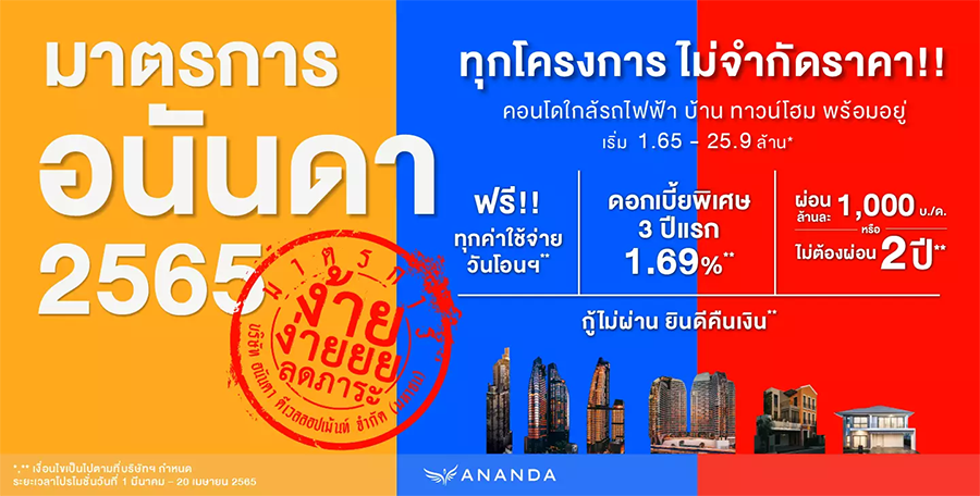 อนันดา ดีเวลลอปเม้นท์ ประกาศออก "มาตรการอนันดาฯ 2565" ช่วยลดภาระค่าใช้จ่าย โดยการนำทั้งคอนโดมิเนียม บ้านเดี่ยว และทาวน์โฮม บนทำเลกรุงเทพฯ ทุกโครงการของอนันดาฯ ภายใต้แบรนด์คุณภาพราคาเริ่ม 1.65-29.5 ล้านบาท มาร่วมจัดโปรโมชั่นพิเศษสุด ตั้งแต่วันนี้ - 20 เมษายน 2565