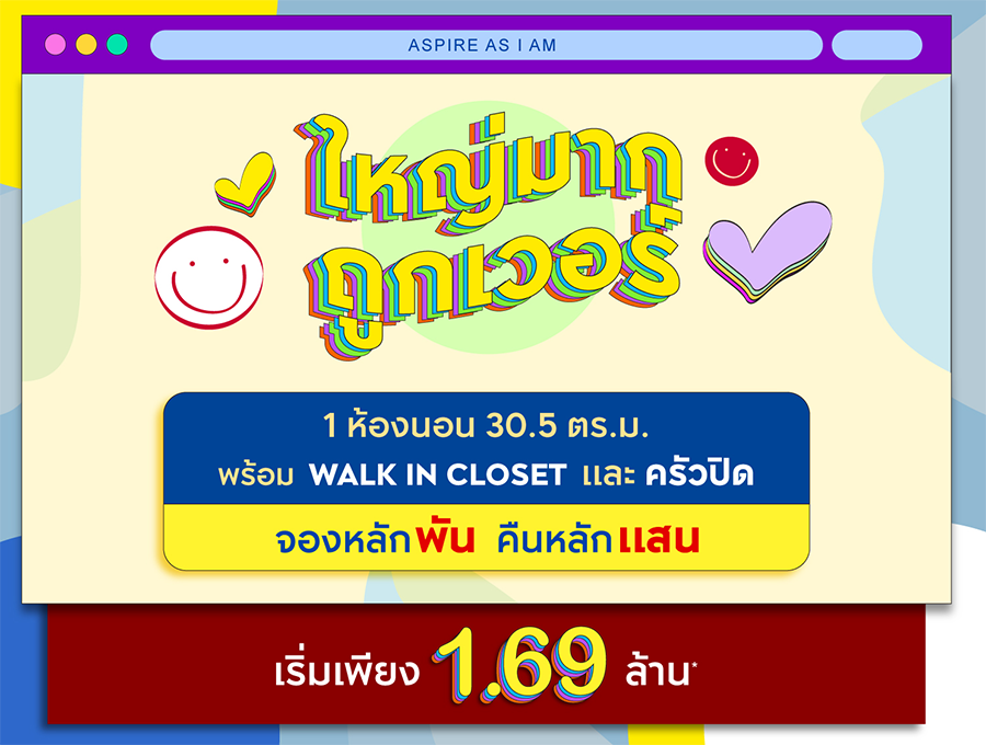 ใหญ่มากกก ถูกกกเวอร์ จองเพียงหลักพัน รับเงินคืนหลักแสน!! แอสปาย รัตนาธิเบศร์ เวสตัน ส่วนกลางที่เติมเต็ม Lifestyle แบบส่วนตัว มากกว่า 1,000 ตร.ม. Free Space ให้คุณใช้ทุกพื้นที่ได้อย่าง Free Style คุ้มทุกตารางเมตร 1 ห้องนอน ไซส์ใหญ่ 30.5 ตร.ม. เริ่มเพียง 1.69 ล้าน* จองวันนี้