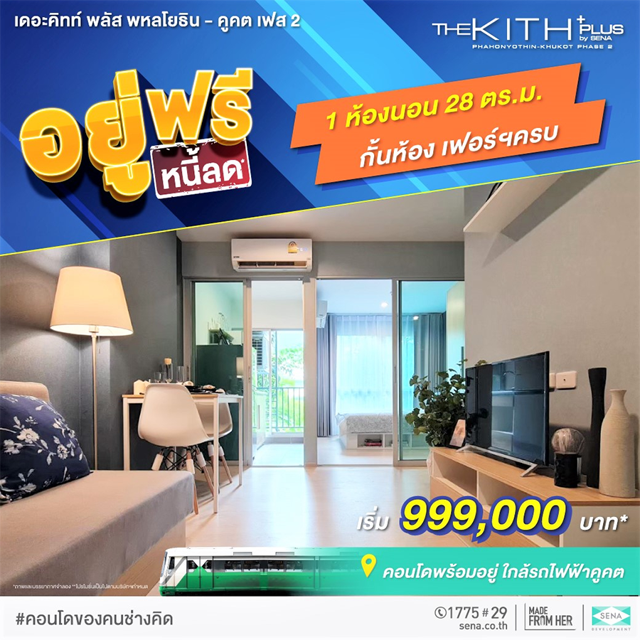 เดอะคิทท์ พลัส พหลโยธิน-คูคต เฟส 2 จัดโปรสุดพิเศษ "อยู่ฟรี...หนี้ลด" คอนโดพร้อมอยู่ ติดถนนใหญ่ ใกล้รถไฟฟ้าสถานีคูคต เริ่มเพียง 999,000 บาท* ปลดล็อกมาตรการ LTV บ้านหลังที่ 2-3 กู้เต็ม เข้าร่วมโครงการบ้านล้านหลัง กู้ง่าย ดอกต่ำ ผ่อนถูก*