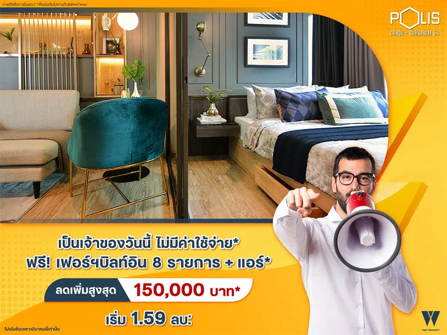 คอนโด โพลิส คอนโด สุขสวัสดิ์ 64 คอนโดสไตล์รีสอร์ท 2 สระว่ายน้ำหรู ทำเลดีใกล้บิ๊กซีสุขสวัสดิ์ เเละ Homepro รองรับรถไฟฟ้าสายสีม่วงใต้ ฟรีบริการชัตเตอร์บัสรับส่ง มอบข้อเสนอพิเศษ ผ่อนล้านละ 2,500 บ.* เป็นเจ้าของวันนี้ไม่มีค่าใช้จ่าย* เริ่ม 1.59 ล้านบาท* โปรโมชั่นตั้งแต่วันที่ 1 - 31 มี.ค. นี้เท่านั้น
