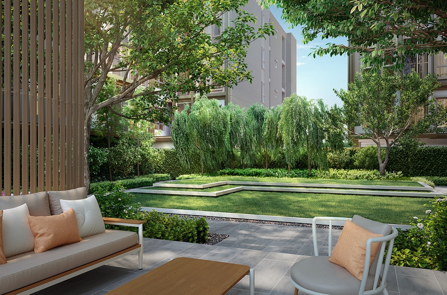 เริ่มต้นกับการจัดวางผังโครงการในส่วนชั้น G กับการออกแบบ Landscape พื้นที่สีเขียวและต้นไม้ใหญ่ ที่โอบล้อมพื้นที่ส่วนกลางแบบ Outdoor ไว้ในตำแหน่ง Centerpiece ของโครงการ เพื่อให้ทุกย่างก้าวทุกมุมมองของผู้อาศัยเกิดความรู้สึกผ่อนคลาย และเข้าถึงความร่มรื่นของธรรมชาติได้ในทุกช่วงเวลา พร้อมดีไซน์ฟังก์ชันพื้นที่ใช้งานที่สอดแทรกองค์ประกอบภูมิสถาปัตย์แบบลดหลั่นเล่นระดับ เพิ่มบรรยากาศความเป็นส่วนตัวสูงสุดแม้อยู่ในพื้นที่ส่วนกลาง