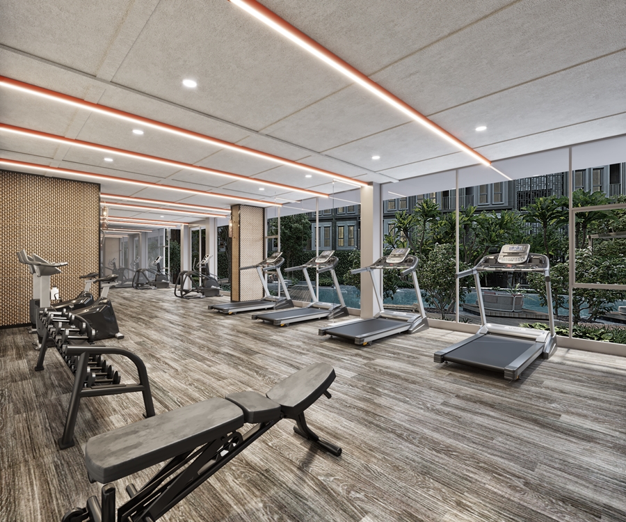 "The Gym" ฟิตเนสวิวสระและแนวต้นไม้ใหญ่ ตอบอินไซต์จริงของการออกกำลังกาย พร้อมการดีไซน์ระยะห่างระหว่างเครื่องออกกำลังกายอย่างพอเหมาะ รวมถึงเพิ่ม Panel ใส กั้นระหว่างลู่วิ่ง ปลดล็อคทุกความกังวลใจในการออกกำลังกายได้อย่างเต็มที่