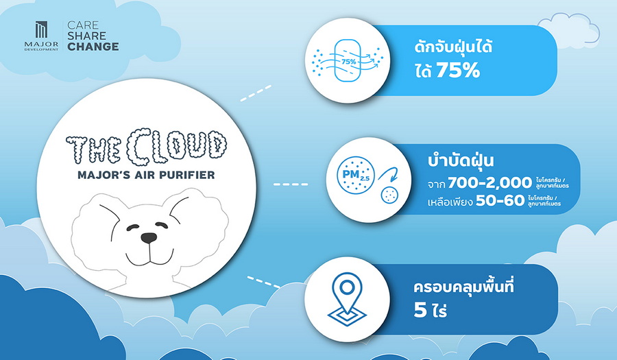 นางสาวเพชรลดา พูลวรลักษณ์ ประธานเจ้าหน้าที่บริหาร บริษัท เมเจอร์ ดีเวลลอปเม้นท์ จำกัด (มหาชน) ผู้นำด้านการพัฒนาธุรกิจอสังหาริมทรัพย์ระดับลักซูรีและคอนโดมิเนียมเลี้ยงสัตว์ได้ (Pet-Friendly Residences) กล่าวว่า หลังบริษัทยกระดับมาตรฐานงานก่อสร้าง โดยติดตั้ง "The Cloud Major’s Air Purifier" เครื่องบำบัดอากาศขนาดใหญ่ในพื้นที่ก่อสร้างใหม่ทุกโครงการ ซึ่งปัจจุบันได้ติดตั้งอยู่บริเวณพื้นที่ก่อสร้างของ โครงการเมทริส ดิสทริค ลาดพร้าว (Metris District Ladprao) และ โครงการมอลตัน เกทส์-กรุงเทพกรีฑา (Malton Gates-Krungthep Kreetha) และทยอยติดตั้งในทุกโครงการที่อยู่ระหว่างการก่อสร้าง เพื่อลดผลกระทบต่อสิ่งแวดล้อมและชุมชน ล่าสุด บริษัทฯ ได้รับรายงานจากการตรวจวัดข้อมูล พบว่าพื้นที่ดังกล่าวมีปริมาณฝุ่นละอองโดยรวมลดลงอย่างมีนัยสำคัญ ถึงราว 30%