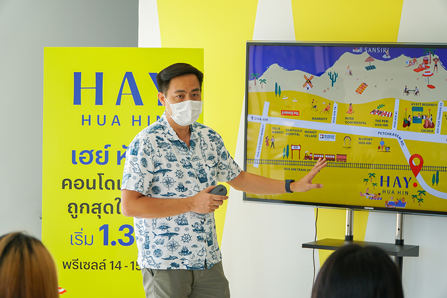 เฮย์ หัวหิน (Hay Huahin) มูลค่าโครงการ 350 ล้านบาท เป็นแบรนด์คอนโดน้องใหม่ เน้นการใช้สีเหลือง-น้ำเงิน สดใส สะดุดตา สะท้อนความสดชื่น มาพร้อมกับแท็กไลน์สุดแคชชี่ ‘Let’s say HAY! เปิดรับความสดใส วันไหน ๆ ก็เฮย์ สัมผัสบรรยากาศความสดใส เรียบง่าย แต่ยังสนุกไม่หยุดนิ่งในแบบคนรุ่นใหม่’ ตั้งอยู่บนทำเลศักยภาพใจกลางเมืองหัวหิน ติดถนนเพชรเกษม รายล้อมด้วยสิ่งอำนวยความสะดวกในรัศมี 5 กิโลเมตร ใช้เวลาในการเดินทางไปแต่ละที่เพียง 5-10 นาที ใกล้แหล่งไลฟ์สไตล์ ห้างสรรพสินค้าและสถานที่ท่องเที่ยว เช่น Blúport Hua Hin, Market Village Hua Hin, Tamarind Market และ Cicada Market ใกล้โรงแรม 5 ดาวระดับโลก เช่น โรงแรมเดอะ สแตนดาร์ด หัวหิน, โรงแรมแมริออท หัวหิน, โรงแรมอินเตอร์คอนติเนนตัล หัวหินและโรงแรมไฮแอท รีเจนซี่ หัวหิน ใกล้โรงพยาบาล เช่น โรงพยาบาลซานเปาโลและโรงพยาบาล กรุงเทพ-หัวหิน รวมทั้งใกล้สถานีรถไฟหัวหิน โดย “เฮย์ หัวหิน” เป็นคอนใหม่แต่งครบ การันตีความคุ้มค่าคุ้มราคา ถูกสุดในเมืองหัวหิน เริ่ม 1.39 ลบ.* เฉลี่ย 60,000 บาท/ตร.ม. ทำให้การมีคอนโดใจกลางหัวหินเป็นเรื่องง่าย ผ่อนถูกกว่าเช่า
