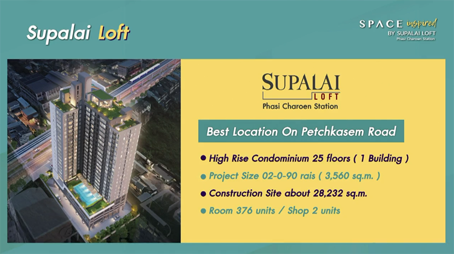 - บมจ.ศุภาลัย ผู้นำอันดับหนึ่งด้านอสังหาริมทรัพย์เดินหน้าผุดโครงการใหม่ล่าสุดบนทำเล เพชรเกษม เปิดตัวคอนโดฯ ศุภาลัย ลอฟท์ สถานีภาษีเจริญ (Supalai Loft Phasi Charoen Station) มูลค่า 1,056 ล้านบาท จำนวน 378 ยูนิต เล็ง ! สามารถทำยอดขายได้เกินเป้า
