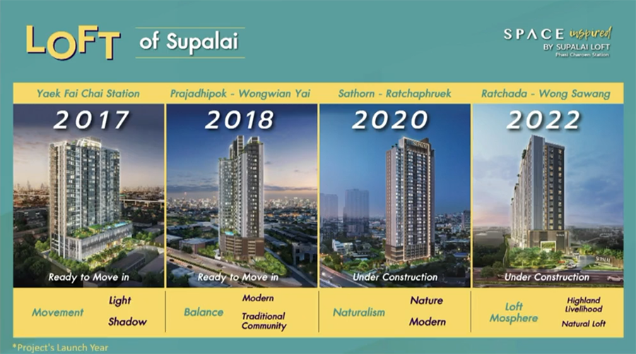 ด้าน นายชัยจักร วทัญญู ผู้อำนวยการฝ่ายอาวุโส ฝ่ายสร้างสรรค์และพัฒนาผลิตภัณฑ์ บริษัท ศุภาลัย จำกัด (มหาชน) กล่าวว่า บริษัทฯ ได้สร้างสรรค์และพัฒนาโครงการคอนโดมิเนียม ภายใต้แบรนด์ศุภาลัย ลอฟท์มาอย่างต่อเนื่อง งานออกแบบอ้างอิงตามยุคสมัย และเทรนด์กระแสนิยม ซึ่งศุภาลัย ลอฟท์ แต่ละโครงการจะมีความโดดเด่นแตกต่างกัน ทุกโครงการเน้นการใช้ทุกพื้นที่อย่างคุ้มค่า และใช้วัสดุเกรดพรีเมี่ยมที่มีรูปลักษณ์เหมาะสมกับโครงการสำหรับแบรนด์ดังกล่าว