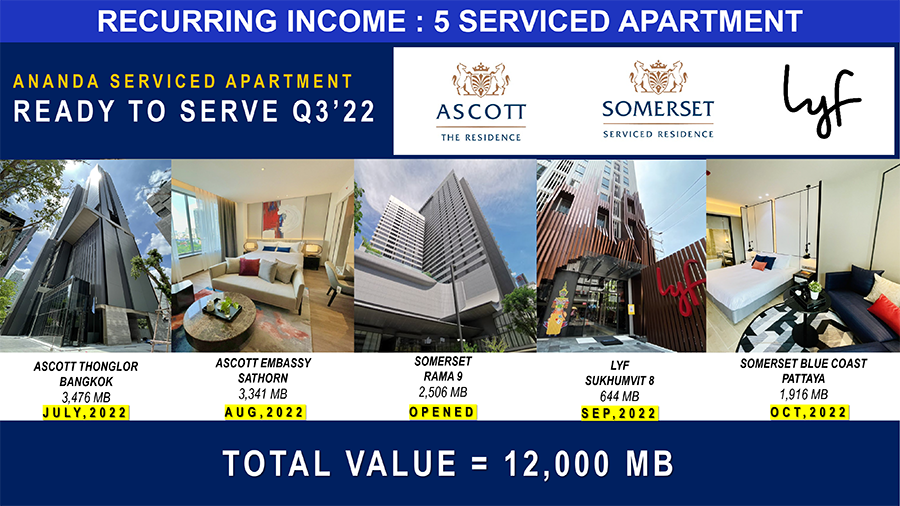 สำหรับโครงการเซอร์วิสอพาร์ทเม้นท์คาดว่าสามารถรับกระแสเงินสดที่เป็นรายได้ประจำสม่ำเสมอ (Recurring Income) จาก 5 โครงการเซอร์วิสอพารท์เม้นท์อย่างต่อเนื่อง โดยบริษัทได้เริ่มเปิดดำเนินการโครงการซัมเมอร์เซ็ต พระราม 9 ในเดือนมีนาคมที่ผ่านมา และจะมีการเปิดโครงการอย่างต่อเนื่องอีก 4 โครงการ คือโครงการแอสคอทท์ ทองหล่อ บางกอก โครงการแอสคอทท์ เอ็มบาสซี สาทร โครงการไลฟ์ สุขุมวิท 8 บางกอก และโครงการซัมเมอร์เซ็ต พัทยา ในเดือน กรกฎาคม สิงหาคม กันยายน ตุลาคม ในปีนี้ เดือนละ 1 โครงการตามลำดับ