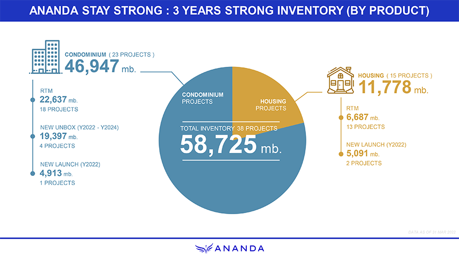 คุณประเสริฐ แต่ดุลยสาธิต ประธานเจ้าหน้าที่บริหาร สายงานธุรกิจอสังหาริมทรัพย์ บริษัท อนันดา ดีเวล ลอปเม้นท์ จำกัด (มหาชน) กล่าวว่า อนันดาฯ ได้เตรียมแผนรองรับดีมานด์ที่จะฟื้นกลับมาในช่วงครึ่งปีหลัง โดยการนำเสนอสินค้าพร้อมอยู่ซึ่งมีโครงการ Inventory ที่แข็งแกร่งมูลค่ากว่า 58,725 ล้านบาท แบ่งตามพอร์ตดังนี้ คือ โครงการที่เป็น RTM (READY TO MOVE) มูลค่า 29,324 ล้านบาท โครงการที่จะสร้างเสร็จ ในปี 2022-2023 มูลค่า 19,397 ล้านบาท และ 3 จาก 7 โครงการ NEW PROJECTS LAUNCH ที่จะสามารถรับรู้รายได้ปี 2022-2023 มูลค่า 10,004 ล้านบาท ซึ่งสามารถรองรับการเติบโตในอีก 3 ปีข้างหน้า
