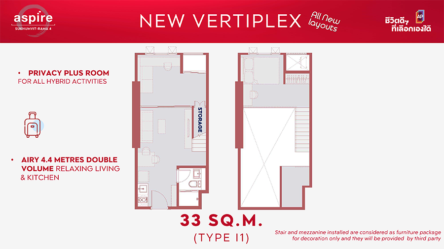 โดยหนึ่งในไฮไลต์ห้องชุดสไตล์ VERTIPLEX ขนาด 33 ตารางเมตร เริ่มด้วยการดีไซน์ส่วนพักผ่อน และพื้นที่ครัวที่เปิดมุมมองที่โปร่งโล่ง ห้องพลัสแบบปิดเป็นสัดส่วนติดอากาศให้สามารถปรับเปลี่ยนฟังก์ชันห้องรองรับทุกกิจกรรมได้อย่างเหมาะสมในแต่ละวัน โดยพื้นที่เพดานที่สูง สามารถติดตั้งชุดเฟอร์นิเจอร์ เพื่อเพิ่มพื้นที่เก็บของดีไซน์พิเศษแบบดับเบิ้ล และห้องนอนบนชั้นลอยพร้อม Walk-In Closet ได้อย่างอิสระ ห้องชุดสไตล์ VERTIPLEX เริ่มในชั้น 31 – 37 ราคาเริ่มต้น 4 - 9 ล้านบาท (129,000 บาท/ตารางเมตร)