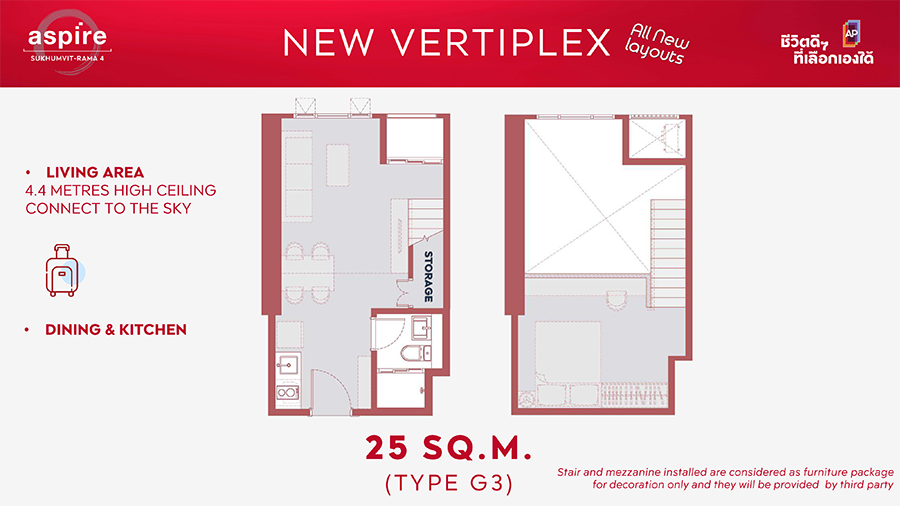 2) รูปแบบ VERTIPLEX : ครั้งแรกของแบรนด์ ASPIRE กับห้องชุดรูปแบบใหม่เพดานสูง Double Volume ที่สูงถึง 4.4 เมตร ขนาดพื้นที่ตั้งแต่ 25 - 52 ตารางเมตร พลิกทุกกฎการออกแบบรองรับไลฟ์สไตล์ที่หลากหลายและความคุ้มค่าในการใช้งานพื้นที่ทุกตารางนิ้วได้จริง พร้อมเปิดรับวิวเมืองและวิวโค้งน้ำบางกระเจ้าได้อย่างเต็มอิ่มเพิ่มขึ้น