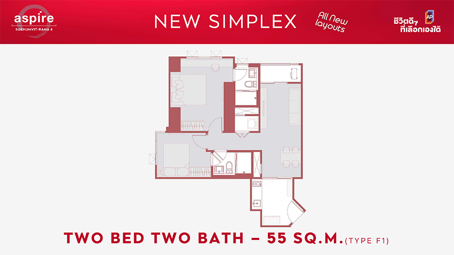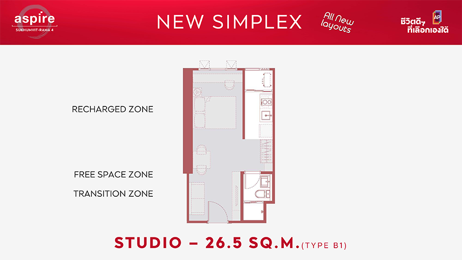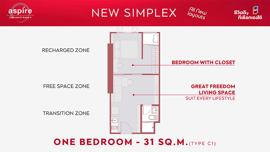 ไฮไลต์แรกของ ASPIRE สุขุมวิท - พระราม 4 กับการประเดิมเปิดตัว "ห้องชุดรูปแบบใหม่ดีไซน์พิเศษ" รวมกว่า 36 รูปแบบ ที่จะเข้ามาเติมเต็มการใช้ชีวิตที่แตกต่างอย่างมีอิสระที่เลือกเองได้ พร้อมพื้นที่แบบ Freespace ที่ลงตัวและใช้งานได้จริงในทุกยูนิต โดยส่วนพักอาศัยเริ่มตั้งแต่ชั้น 8 – 37 โดยแบบห้องชุดมีให้เลือก ดังนี้