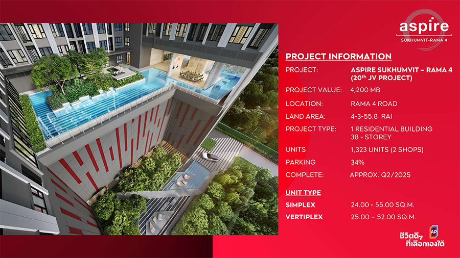 "ASPIRE สุขุมวิท-พระราม 4 คอนโดมิเนียมไฮบริดใหม่ล่าสุด ตั้งอยู่บนที่ดินขนาด 4-3-55.8 ไร่ สูง 38 ชั้น จำนวน 1,323 ยูนิต และ 2 ร้านค้า เป็นโครงการไฮไลต์ใจกลางสุขุมวิทตอนกลาง จากร่วมทุนระหว่างเอพีและมิตซูบิชิ เอสเตท เรสซิเดนซ์ (บริษัทในเครือมิตซูบิชิ เอสเตท กรุ๊ป) ซึ่งนับเป็นการตอกย้ำอีกครั้งถึงความแข็งแกร่งของการพลิกโฉมคอนโดแบรนด์ ASPIRE กับความแตกต่างและโดดเด่นเพียงหนึ่งเดียวในคอนโดมิเนียมแมสเซกเมนต์ที่ดีที่สุดแห่งปี ที่เข้ามาสร้างมาตรฐานใหม่ และเป็นตัวเลือกที่ดีที่สุดของการอยู่อาศัยในคอนโดยุคใหม่ ที่สะท้อนถึงความเป็นที่สุด ตอบทุกอิสระการเลือกใช้ชีวิตของคนเมืองรุ่นใหม่ได้อย่างครบถ้วนในทุกมิติที่ลูกค้ามองหา ควบคู่กับปัจจัยราคาขายที่ดีที่สุดในย่าน"