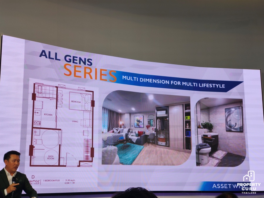 2. Sustainable Life "คิด...เพื่อคนทุกรุ่นทั้งวันนี้ และอนาคต" แอสเซทไวส์ยังได้ออกแบบพื้นที่เพื่อให้ตอบโจทย์คนทุกรุ่น ด้วยยูนิตที่เป็น All Gens Series ภายใต้แนวคิด "Multi Dimension for Multi Lifestyle" ทั้ง Extensive Space การออกแบบพื้นที่ของห้องพักให้กว้างขวาง มาพร้อม Adaptive Design ฟังก์ชั่นการใช้งานที่คุ้มค่า และสามารถปรับเปลี่ยนการใช้งานได้อย่างหลากหลาย เพื่อสอดรับกับ Flexible Lifestyle ที่มีความยืดหยุ่นสูง รองรับไลฟ์สไตล์การใช้ชีวิตของคนทุกวัย