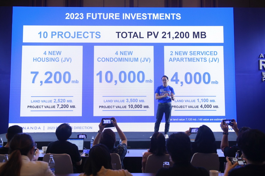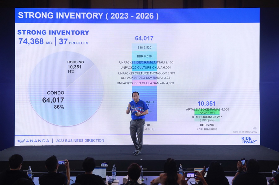คุณประเสริฐ แต่ดุลยสาธิต ประธานเจ้าหน้าที่บริหาร สายงานธุรกิจอสังหาริมทรัพย์ บริษัท อนันดา ดีเวลลอปเม้นท์ จำกัด (มหาชน) กล่าวว่า อนันดาฯ มีแผนรองรับการกลับมาของตลาดอสังหาฯ และดีมานด์ของลูกค้าทั้งในประเทศและต่างชาติ โดยการนำเสนอสินค้าพร้อมอยู่พร้อมโอนซึ่งมีโครงการ Inventory ที่แข็งแกร่งมูลค่าประมาณ 45,000 ล้านบาท แบ่งตามพอร์ตดังนี้ คือ โครงการที่เป็น RTM (READY TO MOVE) มูลค่า 34,880 ล้านบาท โครงการที่จะสร้างเสร็จ ในปี 2023 มูลค่า 10,012 ล้านบาท พร้อมตั้งเป้ายอดรับรู้รายได้ 14,500 ล้านบาท (เติบโต 20% จากปีที่ผ่านมา) เป้ายอดขาย 18,000 ล้านบาท โดยบริษัทฯวางแผนการทำการตลาดในรูปแบบของ ANANDA URBAN CARAVAN นำโครงการพร้อมอยู่ ไปเสิร์ฟถึงมือให้กับกลุ่มลูกค้า GEN-C ด้วยกิจกรรม Roadshow สไตล์คนเมือง ตลอดทั้งปี นอกจากนี้ ยังเตรียมความพร้อมในการบุกตลาดต่างประเทศ เพื่อขยายฐานลูกค้าต่างชาติให้เพิ่มมากขึ้น โดยมีการร่วมมือกับพันธมิตรทางธุรกิจที่มีศักยภาพและแข็งแกร่ง เพื่อตอบรับการที่ต่างชาติเปิดประเทศ โดยนำโครงการระดับพรีเมี่ยมพร้อมการบริการที่มีมาตรฐานในระดับสากลออกสู่ตลาดต่างประเทศอีกครั้ง