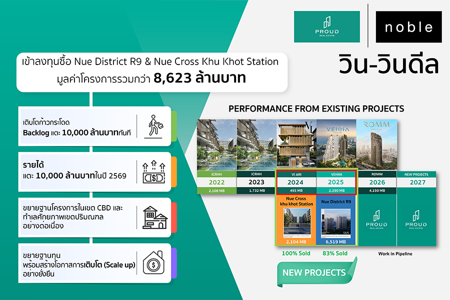 บมจ. พราว เรียล เอสเตท “PROUD” ผนึก บมจ. โนเบิล ดีเวลลอปเมนท์ “NOBLE” เปิดดีล 2 โครงการ นิว ดิสทริค อาร์ 9 (Nue District R9) และนิว ครอส คูคต สเตชัน (Nue Cross Khu Khot Station) มูลค่าโครงการรวมกว่า 8,623 ล้านบาท หนุนผลงาน PROUD เติบโตก้าวกระโดด Backlog แตะ 10,000 ล้านทันที NOBLE จ่อรับรู้กำไรพิเศษ Q3/66 พร้อมกาง Roadmap เดินหน้าพัฒนาโครงการใหม่สร้างการเติบโต ตอกย้ำการเป็นผู้นำอสังหาฯชั้นนำของประเทศ