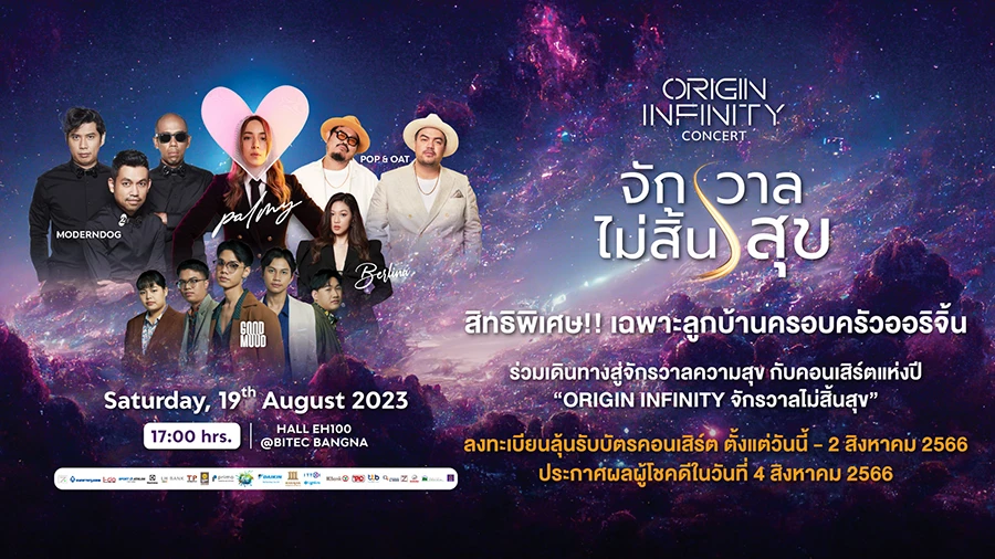 ออริจิ้น พร็อพเพอร์ตี้ ผู้พัฒนาอสังหาริมทรัพย์ครบวงจร เอาใจลูกบ้านครอบครัวออริจิ้น ปักหมุดไบเทค บางนา มอบความสุขแบบทะลุมิติ กับคอนเสิร์ตครั้งใหญ่แห่งปี “Origin Infinity จักรวาลไม่สิ้นสุข” ยกทัพศิลปินยานพ่อ ยานแม่ของวงการ นำโดย ปาล์มมี่ ,โมเดิร์นด็อก ,ป๊อป & โอ๊ต เสริมทัพด้วยศิลปินน้องใหม่มาแรงอย่างวง Goodmood และ Berlina จากค่าย Origin Music ที่แท็กทีมจะมาระเบิดความมันส์สุดขั้ว สร้างความสนุกสุดเหวี่ยง พร้อมกิจกรรมพิเศษหน้างานอีกมากมาย