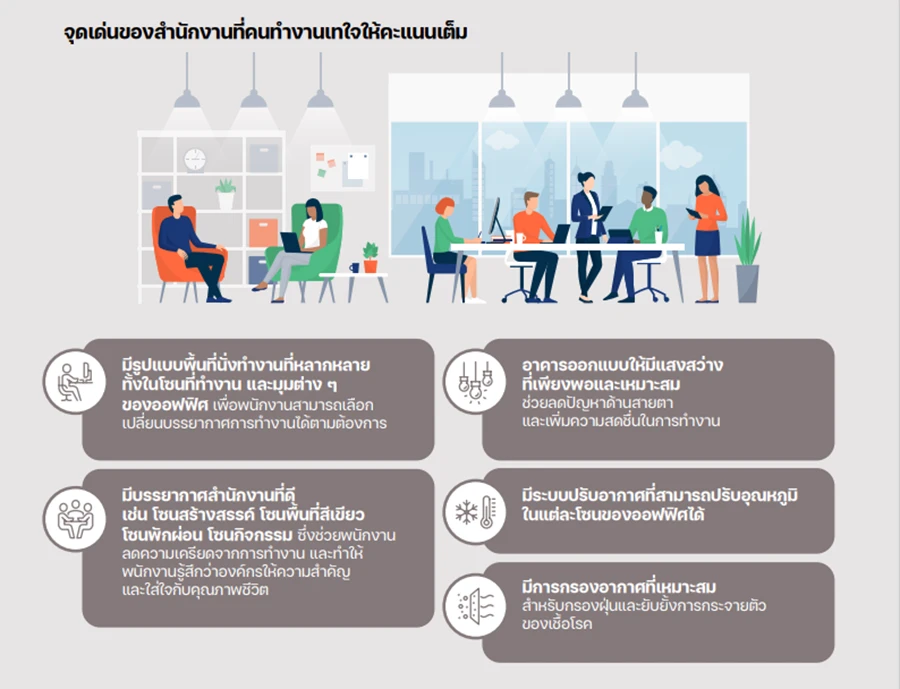 ช่วง Work from Home ที่ยาวนานเป็นจุดพลิกสำคัญของรูปแบบการทำงาน หลังกลับเข้าออฟฟิศ พนักงานให้ความสำคัญกับความสมดุลระหว่างการทำงานและการใช้ชีวิตมากขึ้น สะท้อนได้จากผลสำรวจที่พบว่า 73% ของพนักงานต้องการออฟฟิศที่มีบรรยากาศดี ส่งเสริมการทำงานได้อย่างมีประสิทธิภาพ พร้อมส่งเสริม Well-being หรือสุขภาวะการทำงานที่ดี