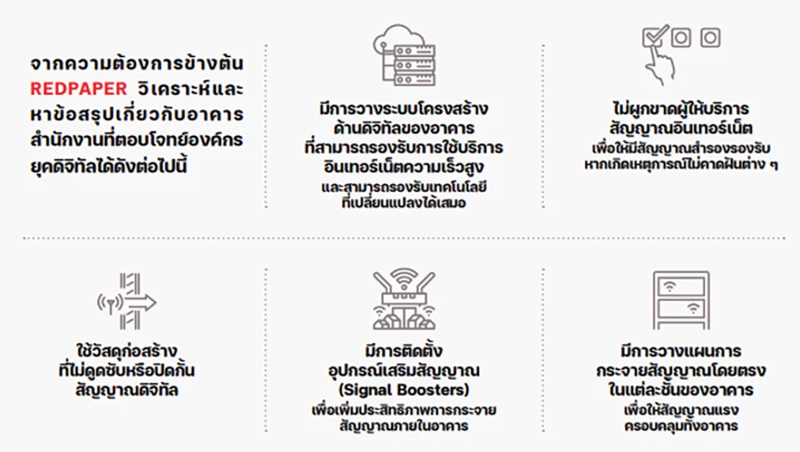 รายงาน REDPAPER ฉบับที่ 5 เรื่อง ไขรหัสความสำเร็จธุรกิจอาคารสำนักงาน: 3 กุญแจดอกใหม่สู่ Tomorrow’s Office ดึงดูดผู้เช่าเต็ม ผูกใจผู้ใช้บริการ ศึกษาปัจจัยที่ผู้ประกอบการและพนักงานให้ความสำคัญสำหรับ “ออฟฟิศแห่งอนาคต” ที่ตอบโจทย์ด้านความสะดวก ช่วยเสริมประสิทธิภาพการทำงานให้กับทั้งองค์กรและพนักงาน โดยจากการสำรวจผู้ประกอบการและชาวออฟฟิศในย่าน CBD ของกรุงเทพฯ  พบว่า 3 ปัจจัยสำคัญอันดับต้นที่มีผลต่อประสิทธิภาพการทำงานและความพึงพอใจของกลุ่มผู้ตอบแบบสอบถาม คือ อาคารสำนักงานต้องตอบโจทย์ด้านดิจิทัล นวัตกรรม และ บรรยากาศสถานที่ทำงาน