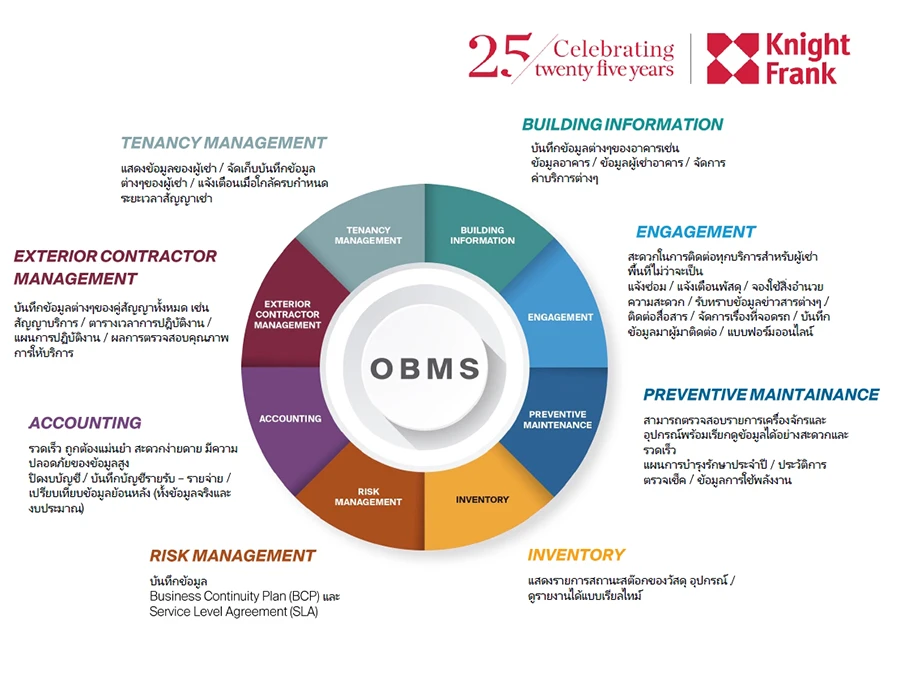 อีกหนึ่งความโดดเด่นของ KF Care คือการบูรณาการโปรแกรมเข้ากับซอฟต์แวร์บัญชีของบริษัท เพิ่มความสะดวกให้การบริหารการเงิน นอกจากนี้ยังช่วยแจ้งเตือนค่าใช้จ่ายต่างๆ ให้ฝ่ายบริหารทราบอย่างสะดวกและง่ายดาย นำไปสู่การติดตามตรวจสอบและการบันทึกอย่างเป็นระบบ OBMS หรือ ระบบการจัดการอาคารสำนักงาน เป็นระบบใหญ่ที่มีฟังก์ชันการทำงานมากมายที่ไนท์แฟรงค์พัฒนาขึ้นเพื่อจัดการอาคารสำนักงานสมัยใหม่อย่างมีประสิทธิภาพ