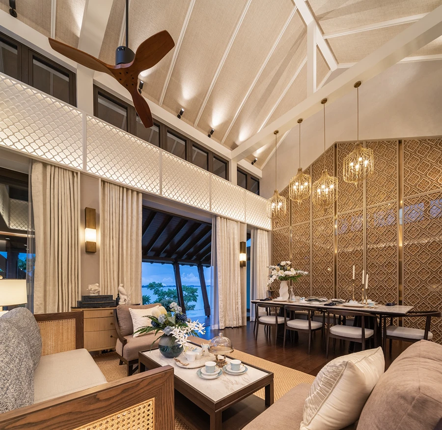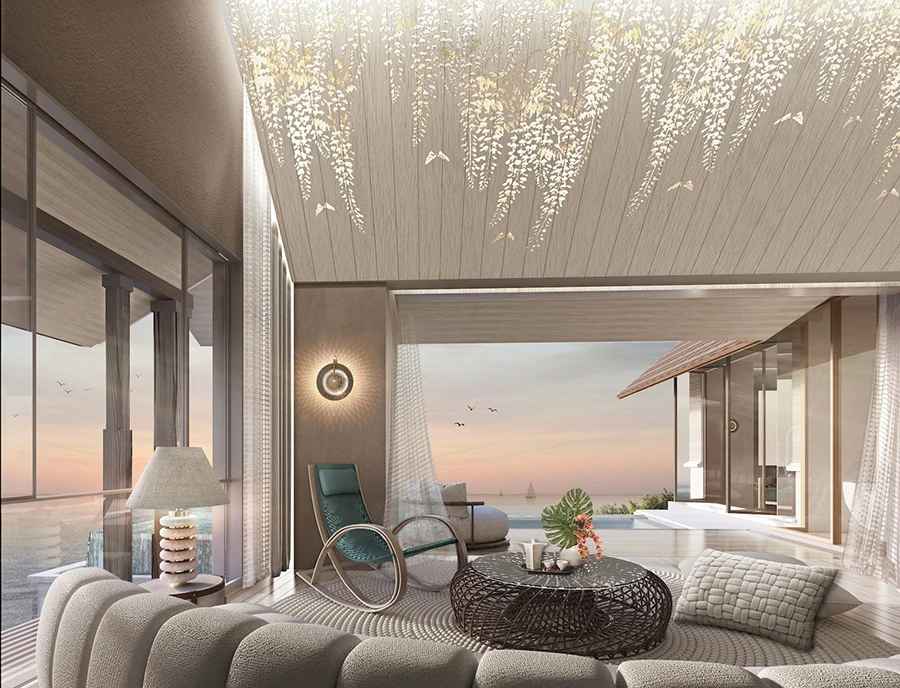 คุณพลัช ไพนุพงศ์ กรรมการผู้จัดการ บริษัท แธท อีส อิธ อินทีเรียร์ จำกัด (That IS ITH Interior) กล่าวว่า “โครงการพูลวิลล่าบนเนินเขาวิวทะลระดับลักชูรีที่เป็นแห่งแรกหนึ่งเดียวใน จ. ระยอง เป็นวิลล่าที่แต่ละหลังไล่ระดับลงมาจนถึงชายหาดซึ่งทำให้ได้รับวิวแบบพาโนรามาทุกยูนิต โดยวิลล่าแห่งนี้มาพร้อมคอนเซ็ปต์ Sea to Sand เหมาะสำหรับกลุ่มคนรุ่นใหม่ในระดับผู้บริหารที่ต้องการบ้านพักตากอากาศหรือ Hideaway Home ที่ไม่ไกลจากกรุงเทพฯ แรงบันดาลใจในการตกแต่งได้มาจากคอนเซ็ปต์ซิกเนเจอร์ของโครงการที่เป็นการออกแบบวิลล่าตามไหล่เขาลงมาถึงหาดทรายใกล้น้ำทะเล เราจึงใช้สีแทนทรายและทะเลด้วย Gradient สีจากสีเนื้อลงมาเป็นสีเทอร์ควอยซ์ ชั้นบนมีผนังเป็นสีทราย ไล่ลงไปเป็นสีทะเลที่ชั้นล่าง ซึ่งบ้านทั้ง 2 ชั้นมีบรรยากาศสบาย ๆ เรียบง่ายแต่คงความหรูด้วยการใช้วัสดุพรีเมียม รวมถึงใช้วัสดุธรรมชาติและองค์ประกอบที่เป็นงานคราฟต์สำหรับการตกแต่ง เช่น ฝ้าเพดานไม้สีอ่อนที่มีงาน Hand Paint ด้วยสีเหลือบมุกของเปลือกหอยและภาพใบไม้พลิ้วไหวไปตามลม ด้านตัวอาคารตั้งอยู่กลมกลืนกับต้นไม้ ได้บรรยากาศที่ร่มรื่นและเป็นหนึ่งเดียวกับธรรมชาติอันสวยงามในระดับเดียวกับเดสติเนชันติดทะเลระดับโลก นอกจากนี้ ‘สกาย บาร์’ ที่เราออกแบบจะเป็นร้านอาหาร Fine Dining และบาร์ของโครงการ มาพร้อมส่วน Indoor และ Outdoor พร้อมที่นั่งชิลหลากหลายสไตล์ที่ห้อมล้อมด้วยน้ำ ให้ทุกคนได้ดื่มด่ำกับวิวทะเลระดับเวิลด์คลาสระหว่างที่เพลิดเพลินกับเครื่องดื่มแบบชิล ๆ การออกแบบเน้นการสร้างบรรยากาศเหมือนอยู่บนเรือยอร์ชสุดหรูในคอนเซ็ปต์ Sail to Sea ที่นั่งด้านนอกเปรียบเสมือนดาดฟ้าของเรือ ในโซน Indoor มีโครงสร้างของเรือที่กำลังมุ่งหน้าสู่ทะเล ใจกลางสเปซยังสร้างความน่าตื่นตาตื่นใจด้วยสถาปัตยกรรมที่ให้แสงสว่างที่มีลูกเล่นเปลี่ยนสีอันงดงามตระการตาในคอนเซ็ปต์สัตว์น้ำใต้ท้องทะเล เพื่อมอบความประทับใจให้ลูกค้าที่มาเยือน”